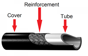 - Hydraulic hoses have a three part construction: tube, reinforcement and cover. The tube is rubber and transports the fluid. Reinforcement is the less flexible braided wire that is wrapped around the tube. The cover surrounding both is the final protection from the elements, adding strength to the hydraulic hose as well.
