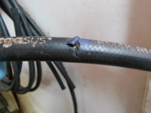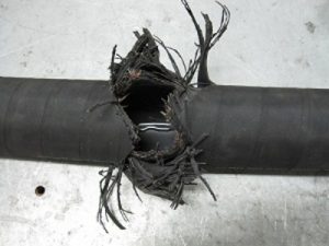 Cover abrasion happens when part of the hydraulic hose cover has been removed, exposing the reinforcement section of the hose. This could be caused by using non compatible fluids or rubbing against objects in the operating environment. Exposed hose reinforcement is susceptible to ruse and accelerated damage. Solution: Re-route the hydraulic hose assembly and bundle hose together that flex in the same direction. Protect the hose from abrasion by using sleeves and spring guards.